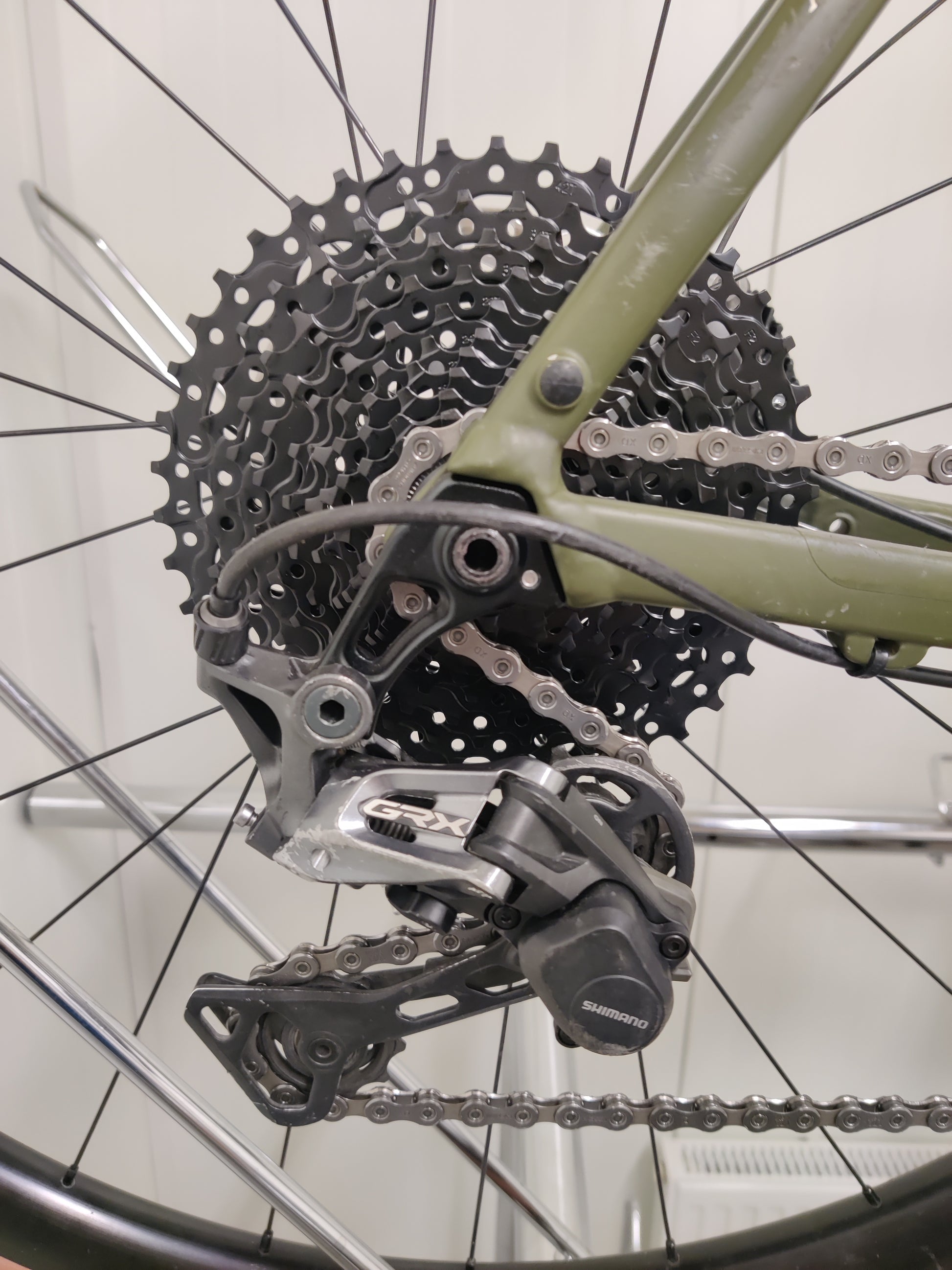 Pyörässä on Shimano GRX RX600 1x11 -osasarja, joka tarjoaa luotettavan ja sujuvan 11-vaihteisen vaihteensiirron raskaissakin olosuhteissa. Tämä gravel-spesifinen vaihteisto on optimoitu soratie- ja epätasaiselle pinnalle, ja se toimii yhtä hyvin asfaltilla kuin poluilla.